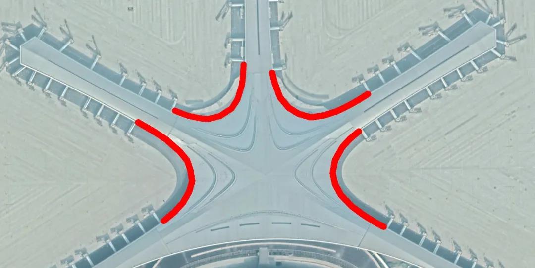 可以看出,“爪”型航站樓部分邊線(xiàn)(上圖中紅色部分)利用不充分。