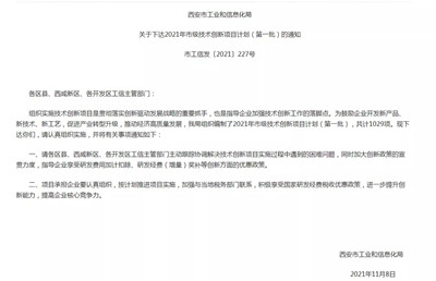 近日,西安市工業(yè)和信息化局公布了2021年市級技術(shù)創(chuàng )新項目名單。