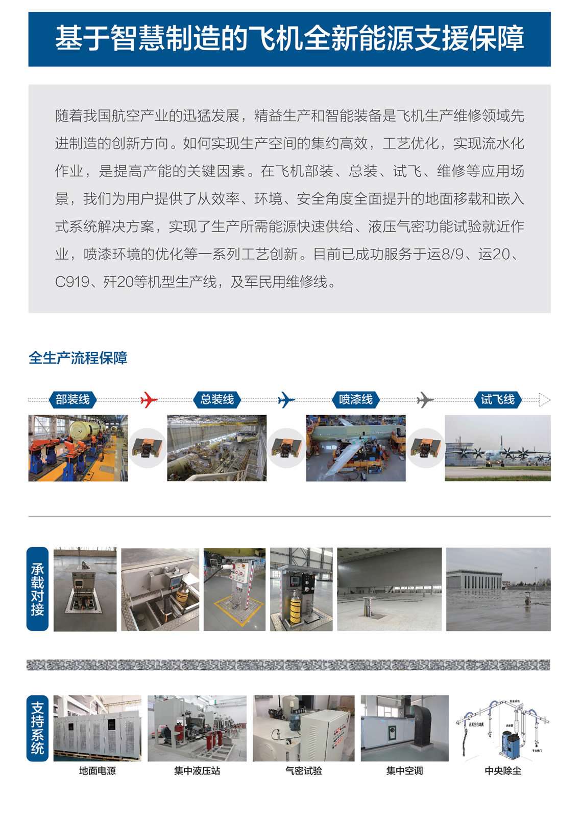 隨著(zhù)我國航空產(chǎn)業(yè)的迅猛發(fā)展,精益生產(chǎn)和智能裝備是飛機生產(chǎn)維修領(lǐng)域先進(jìn)制造的創(chuàng )新方向。如何實(shí)現生產(chǎn)空間的集約高效,工藝優(yōu)化,實(shí)現流水化作業(yè),是提高產(chǎn)能的關(guān)鍵因素。在飛機部裝、總裝、試飛、維修等應用場(chǎng)景,我們?yōu)橛脩?hù)提供了從效率、環(huán)境、安全角度全面提升的地面移載和嵌入式系統解決方案,實(shí)現了生產(chǎn)所需能源快速供給、液壓氣密功能試驗就近作業(yè),噴漆環(huán)境的優(yōu)化等一系列工藝創(chuàng )新。目前已成功服務(wù)于運8/9、運20、C919、殲20等機型生產(chǎn)線(xiàn),及軍民用維修線(xiàn)。